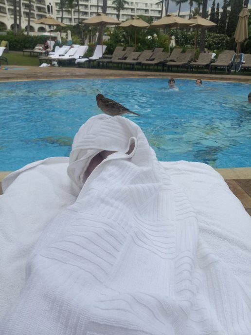 My wife captured one of these moments on her smartphone.  We were bathing in the sun, watching our boys frolic in the swimming pool, when a bird dove in, landing right on the white beach towel covering her toes.  It stayed there, jerking its little head from side to side.  Long enough for my wife to turn her camera on and snap a memorable photograph. Yep, the glorious picture above.