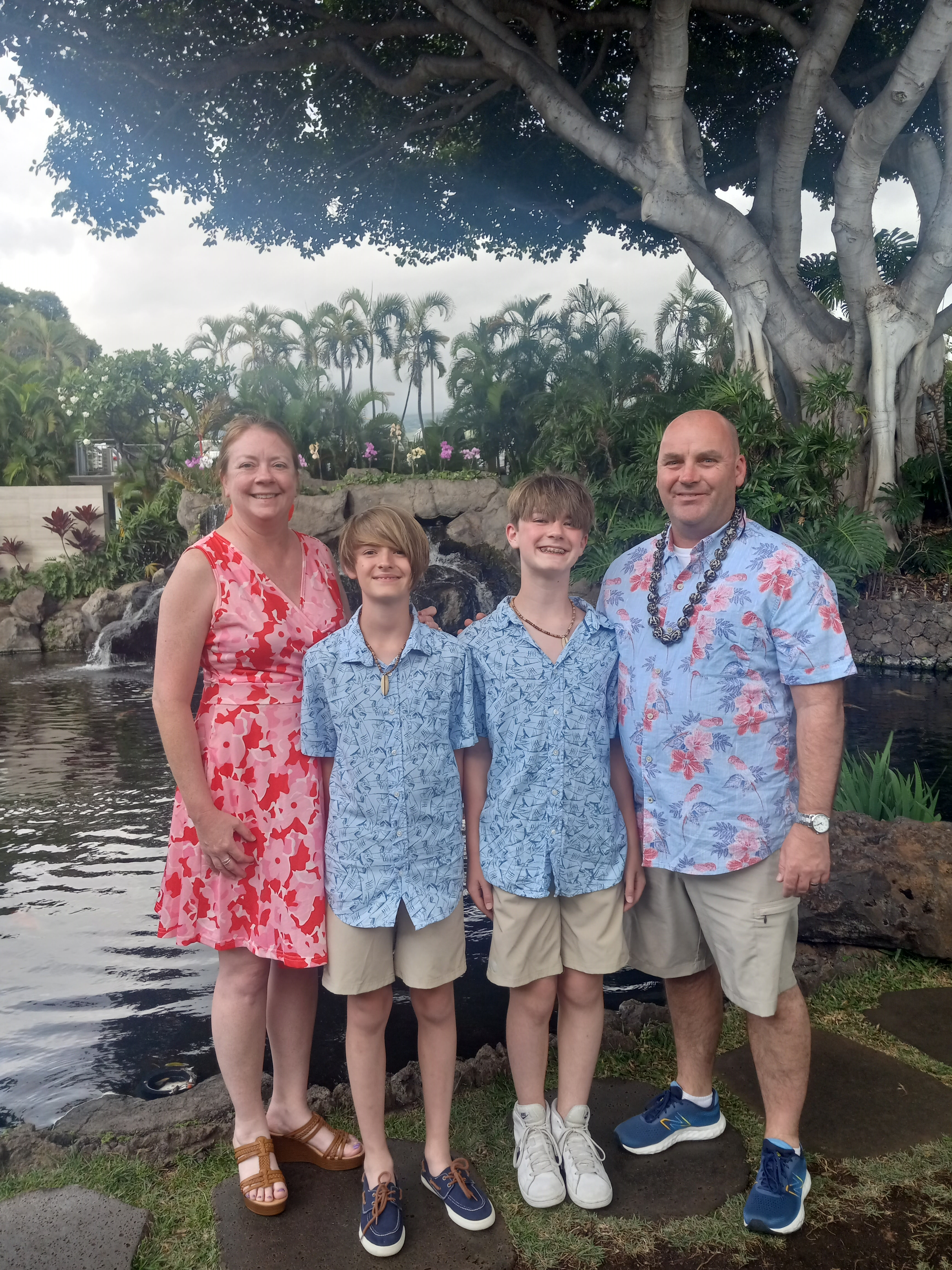 We arrived decked out in our Hawaiian shirts, each receiving a decorative Hawaiian lay. A pleasant offshore breeze blew while a blanket of clouds cooled the hot afternoon sun. All 16 of us, including my family, my parents, and my two brothers and their families, sat down to enjoy the experience.